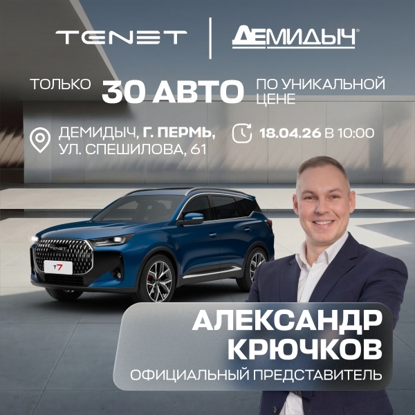 18 апреля — особенный день в «Тенет Демидыч Спешилова»! Специально из Москвы приедет официальный представитель бренда TENET, чтобы лично помочь вам подобрать оптимальный автомобиль и предложить индивидуальные условия покупки в рамках мероприятия «Человек из бренда».